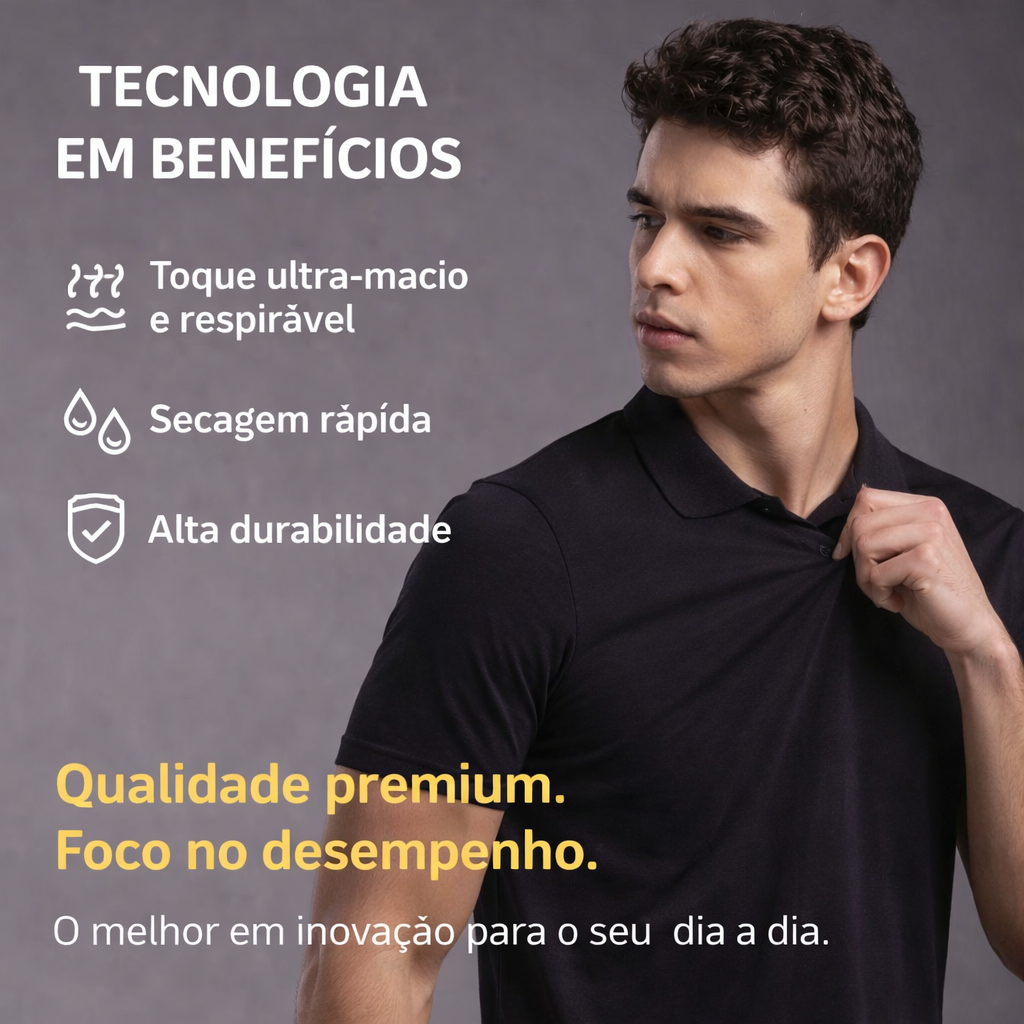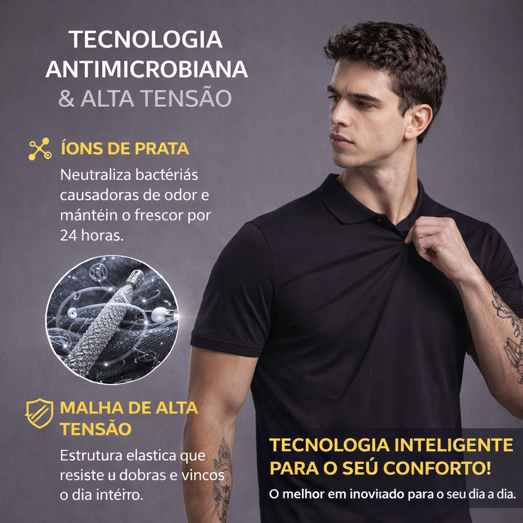Cada fibra da Nexus Polo foi projetada com precisão molecular para oferecer proteção anti-odor e resistência anti-amassado sem comprometer o conforto ou a elegância.